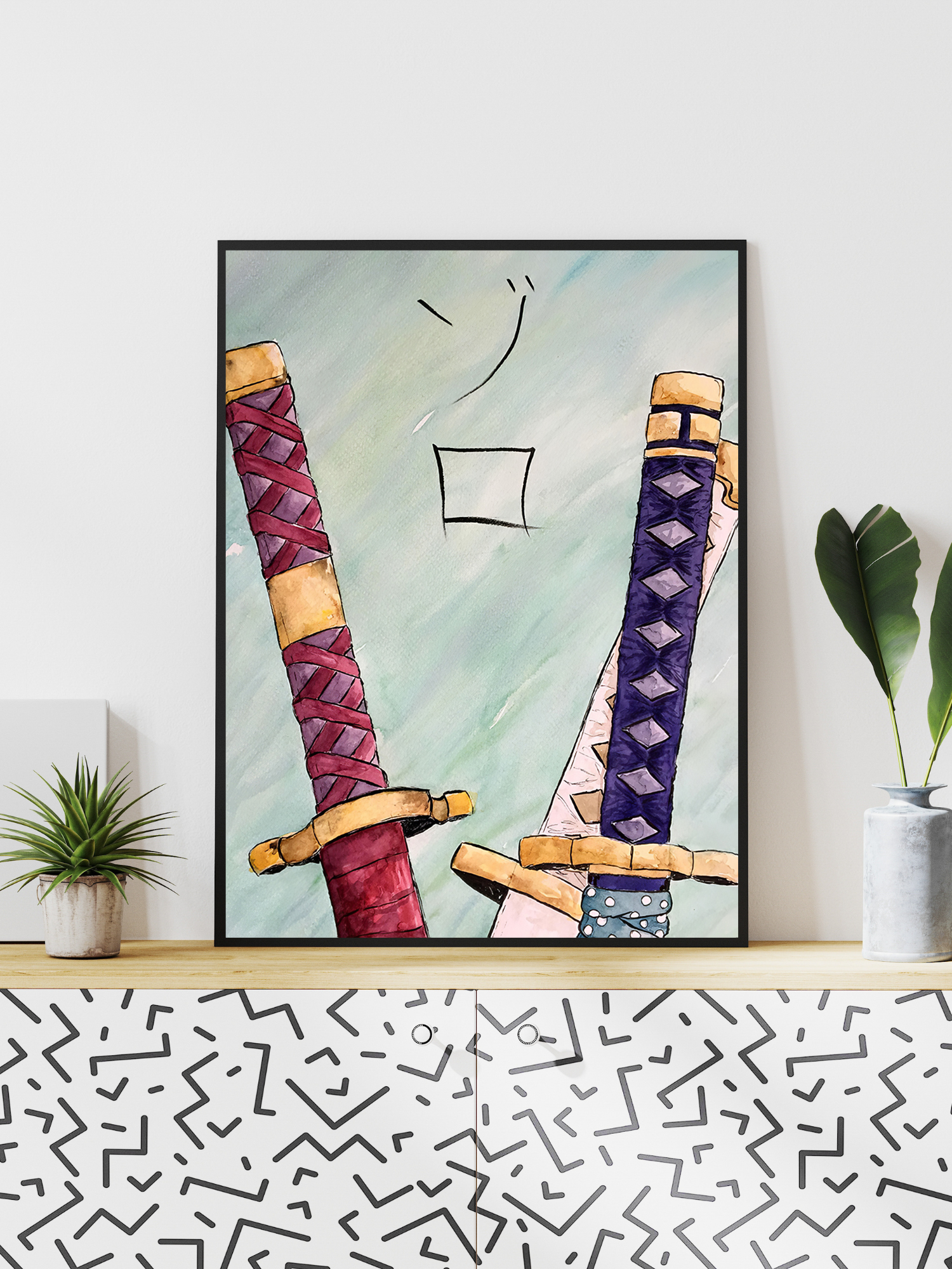 Transform your space into the world of One Piece with the iconic Zoro's Katanas poster. Featuring the three swords wielded by the skilled swordsman Roronoa Zoro, this poster is a must-have for any fan of the popular anime series. The detail and vibrant colors of the katanas will transport you to the high seas and make you feel like a part of the Straw Hat Pirate crew. Hang this poster on your wall and show off your love for One Piece and the legendary swordsman Zoro.